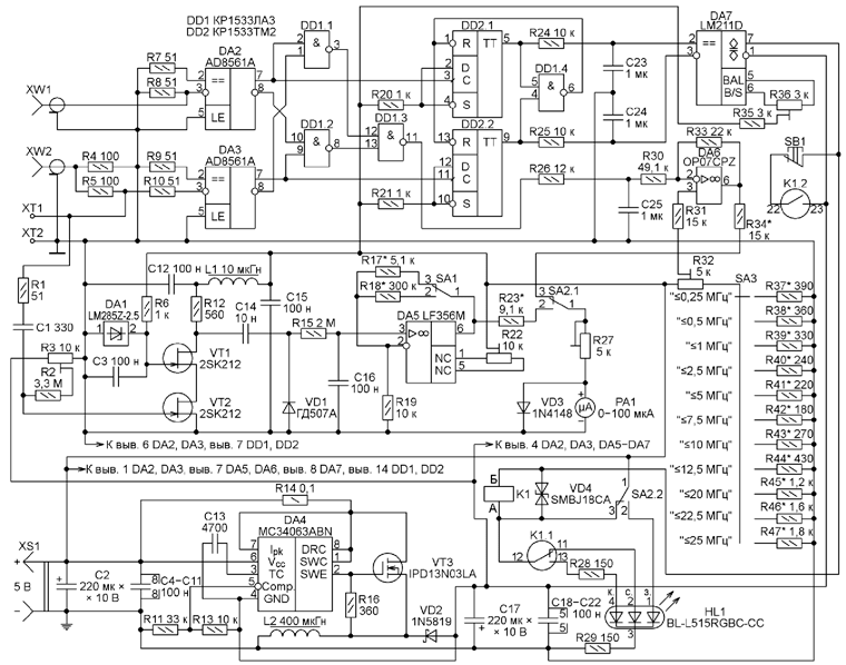 Схема приставки изображена на рис. 1. Высокочастотный милливольтметр построен по схеме "усилитель переменного тока - детектор - усилитель постоянного тока". Его входное сопротивление - 3 МОм, входная ёмкость - 4 пФ. Пределы измерения 0-100 мВэфф и 0-1000 мВэфф выбирают переключателем SA1. Входной усилитель милливольтметра выполнен на транзисторах VT1 и VT2 по каскодной схеме. Напряжение +2,5 В на затворе транзистора VT1 стабилизировано интегральным источником образцового напряжения DA1. На затвор транзистора VT2 подано отрицательное напряжение смещения, устанавливаемое под-строечным резистором R3. Усиленное напряжение высокой частоты поступает через конденсатор C14 на детектор (диод VD1) и далее через ФНЧ R15C16 на усилитель постоянного тока на ОУ DA5. В режиме измерения напряжения переключателем SA2.1 к выходу этого ОУ подключён стрелочный микроамперметр PA1. Для защиты индикатора от перегрузок установлен диод VD3.