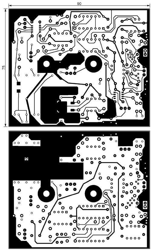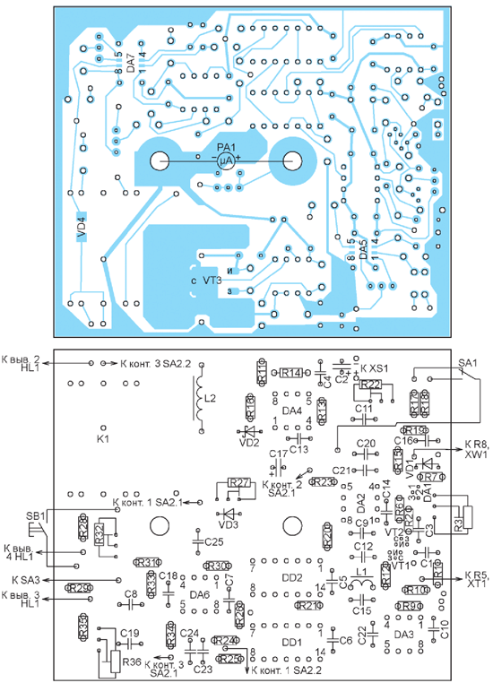 Приставка собрана в литом алюминиевом корпусе G0476 размерами 82,5x152,4x50,8 мм. Почти все её детали смонтированы на печатной плате размерами 90x75 мм, чертёж печатных проводников которой приведён на рис. 2, а схема расположения элементов на нёй - на рис. 3. Плату надевают на выводы микроамперметра PA1 и закрепляют на них гайками. Общий провод соединён с корпусом устройства.