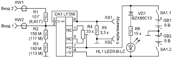 Большинство производимых сегодня мультиметров (UNI-T, APPA ME-TERMAN и т. д.) имеют входное сопротивление не более 10MОм. Однако в некоторых случаях, когда измерения проводят в высокоомных цепях, этого может оказаться недостаточным. Автор статьи столкнулся именно с такой проблемой. Её решение оказывается наиболее простым, если использовать буферный повторитель напряжения, к выходу которого подключают мультиметр. Такую приставку проще всего собрать на основе операционного усилителя (ОУ). Важен выбор самого ОУ, который должен иметь высокое входное сопротивление. Желательно также, чтобы он имел возможно широкий интервал входного напряжения. Выбор пал на недорогой ОУ LF356 с полевыми транзисторами на входе. Напряжение питания его находится в пределах 2x5...2x22 В и максимальное входное напряжение (которое должно оставаться меньше питающего) - ±20 В. Входное сопротивление микросхемы равно 1 ТОм, а входная ёмкость - 3 пФ.