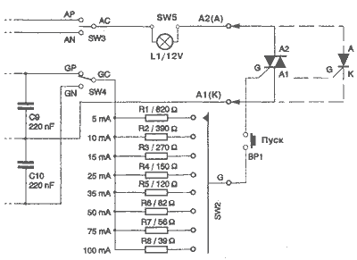 Величину управляющего тока определяют резисторы R1 - R8, включаемые в цепь управляющего электрода с помощью переключателя SW2. Напряжение на управляющем электроде тиристора или симистора составляет примерно 1 В, поэтому величина управляющего тока рассчитывается по следующей формуле: