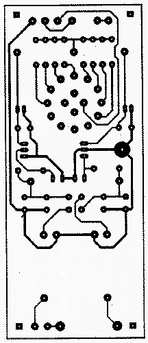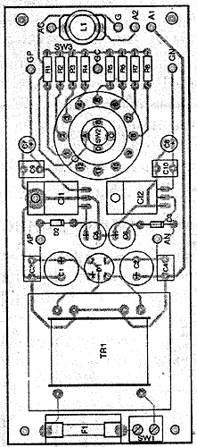![]() Рис. 2. Разводка печатной платы пробника | ![]() Рис. 3. Схема размещения радиодеталей на плате пробника |
