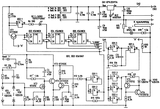 Входной сигнал произвольной формы амплитудой 100 мВ...50 В через разделительно-защитную цепь (рис.1) поступает на затвор полевого транзистора VT2. Этот каскад обладает высоким входным сопротивлением и малой входной емкостью, поэтому практически не шунтирует сигнал амплитудой до 3 В в диапазоне звуковых частот. Усиленный входной сигнал со стока VT2 поступает на дифференциальный усилитель на транзисторах VT3, VT4. С коллектора VT4 снимается сигнал близкой к прямоугольной формы и поступает на триггер Шмитта DD1.1, DD1.2. Сигнал прямоугольной формы снимается с вывода 11 DD1.2 и подается для последующей обработки на микросхемы DD3...DD5, включенные как делители частоты на 10.