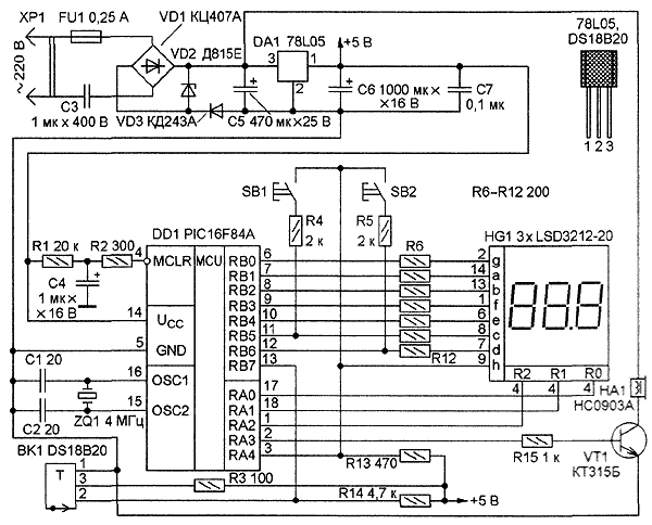 Принципиальная схема предлагаемого термометра изображена на рис.1. Его основа - популярный микроконтроллер (МК) PIC16F84A (DD1). Для измерения температуры использован интегральный цифровой датчик (ВК1) DS18B20 фирмы MAXIM. Эта микросхема не требует калибровки и позволяет измерять температуру окружающей среды от -55 до +125 °С, причем в интервале -10...+85 °С производитель гарантирует абсолютную погрешность измерения не хуже ±0,5 °С. Датчик DS18B20 - наиболее совершенный из широко известного семейства DS18X2X, выпускавшихся ранее под маркой Dallas Semiconductor. В отличие от функциональных аналогов DS1820 и DS18S20 он перед началом измерения позволяет задать необходимую относительную точность преобразования температуры из следующего ряда значений: 0,5; 0,25; 0,125 и 0,0625 °С, при этом время измерения равно соответственно 93,75; 187,5; 375 и 750 мс.
