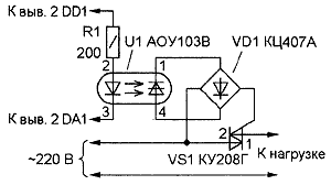 При работе устройства с термостатом сигнал для управления нагревателем или компрессором холодильника снимается с выхода RA3, при этом вместо каскада на транзисторе VT1 устанавливают оптосимисторное реле, управляющее питанием исполнительного устройства или контактора, который, в свою очередь, подключает нагреватель или компрессор к электросети. Схема возможного варианта такого реле показана на рис.2.
