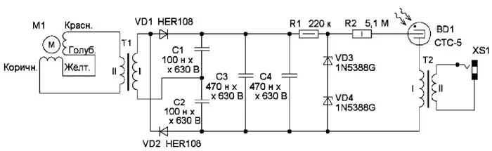 Схема индикатора показана на рис. 1. В качестве электрогенератора использован шаговый электродвигатель WESTON 4SHG-023A 39S 2.3V 1.5E 1.8’/STEP J.D.K 891. Этот электродвигатель имеет две обмотки, которые соединяют последовательно. К электродвигателю подключён трансформатор T1, который повышает напряжение, вырабатываемое генератором, примерно до 150...200 В. Применён понижающий маломощный трансформатор с максимально допустимым током вторичной обмотки 0,3 А, при этом его низкоомная (в обычном случае вторичная) обмотка под ключена к шаговому двигателю, а высокоомная (в обычном случае первичная) обмотка подключена к удвоителю напряжения, который собран на конденсаторах С1, С2 (К73-17) и диодах VD1, VD2. На выходе удвоителя напряжения установлены накопительные конденсаторы С3, C4 (К73-11). Напряжение с этих конденсаторов поступает на параметрический стабилизатор напряжения R1VD3VD4, который предотвращает появление на счётчике Гейгера напряжения выше 400 В даже при быстром вращении вала генератора. От этого стабилизатора через резистор R2 (МЛТ) осуществляется питание счётчика Гейгера BD1 (СТС-5).