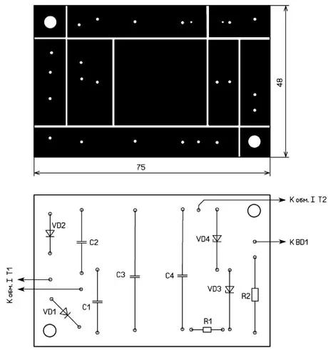 Большая часть элементов индикатора размещена на односторонней печатной плате, изготовленной из стеклотекстолита толщиной 1,5...2 мм методом прорезания фольги. Чертёж платы показан на рис. 2.