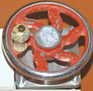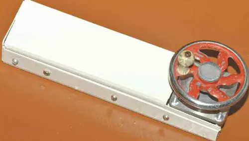 Корпус индикатора изготовлен из отрезка пластмассового кабельного короба длиной 240 мм с поперечными размерами 60x35 мм [13]. Крышка имеет длину 175 мм, закрывая все основные компоненты, кроме шагового двигателя, который располагается в одном из торцов корпуса (рис. 3). На вал шагового двигателя надет маховик от детской швейной машинки (рис. 4).