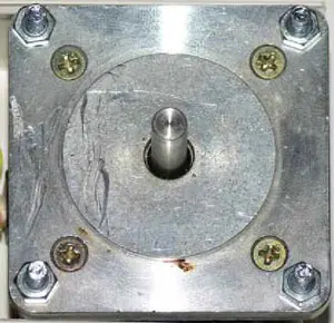 К корпусу с помощью четырёх винтов М4х50 с гайками крепится шаговый двигатель (рис. 6). Трансформаторы T1 и T2 закреплены с помощью хомутов, изготовленных из перфорированной металлической ленты. Счётчик BD1 крепится с помощью пластиковых самодельных хомутов. Общее расположение элементов устройства в корпусе показано на рис. 7.
