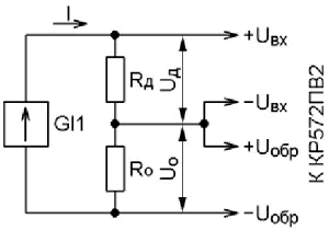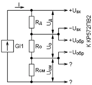 Точность измерения в этом случае зависит от температурной стабильности не только Rо, но и Rсм. Однако у микросхемы КР572ПВ2 входы для подачи напряжения Uсм не предусмотрены. В предлагаемом варианте термометра решена не только эта, но и другие проблемы. Он нечувствителен к стабильности тока, протекающего через датчик, дрейфу нуля и дрейфу коэффициента усиления входящего в состав прибора операционного усилителя, к сопротивлению проводов, соединяющих датчик и термометр, переходному сопротивлению контактов разъёма датчика, а в случае применения нескольких переключаемых датчиков - к переходному сопротивлению контактов переключателя.