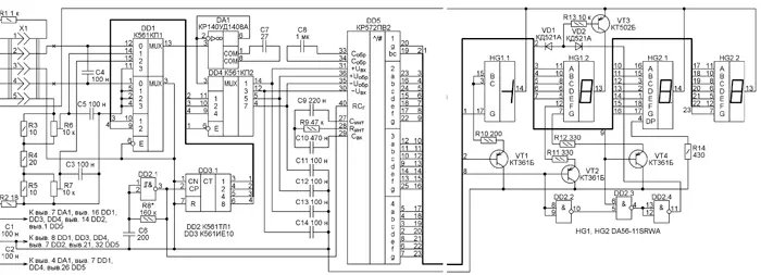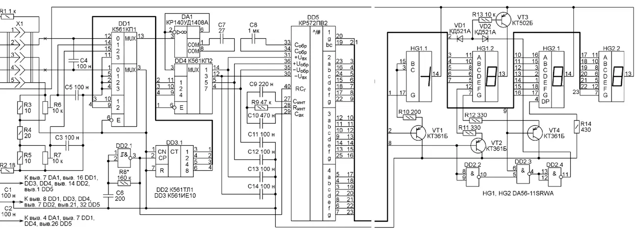 Схема термометра показана на рис. 3. Подаваемые на входы микросхемы DD5 напряжения формируются на конденсаторах C11-C14, поочерёдно подключаемых к выходу ОУ DA1 селектором-мультиплексором DD4 (К561КП2), способным коммутировать и аналоговые сигналы. Синхронно с DD4 селектор-мультиплексор DD1 (К561КП1) подключает к входу ОУ напряжение с резисторов измерительной цепи.