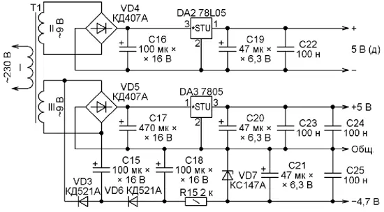 В блоке питания (рис. 4) отрицательное напряжение -4,7 В формируется способом, описанным в [2], что позволяет использовать трансформатор T1 с меньшим числом вторичных обмоток.