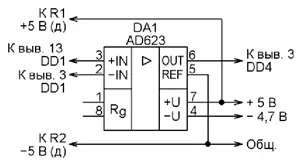 Такой усилитель желателен ещё и потому, что он обладает большим коэффициентом ослабления синфазных помех, неизбежно возникающих на соединительных проводах датчика. Схема включения усилителя в термометр изображена на рис. 5. Можно применить инструментальный усилитель и другого типа, например, AD8221, LT1168, MAX4194.
