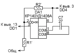 Элементы DD2.2-DD2.4, резисторы R11-R13, диод VD2, транзисторы VT2-VT4 служат для гашения незначащего нуля на индикаторе HG1.2 (разряд десятков градусов). Диод VD1 блокирует гашение нуля при температуре выше 99,9 оС, когда на индикаторе HG1.1 выводится единица. Транзисторы VT1, VT2 и VT4 умощняют выходы микросхемы DD5, обеспечивая их уровни, приемлемые для микросхемы DD2.