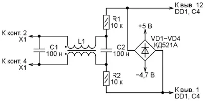 Применение фильтра, схема которого изображена на рис. 8, позволит значительно ослабить синфазные помехи, а также защитить входы микросхемы DD1 от перенапряжений, которые могут в каких-либо аварийных ситуациях образоваться на проводах, соединяющих датчик с термометром. Двухобмоточный дроссель L1 можно найти в цепях сетевого питания многих электронных приборов, например, компьютерных мониторов. Фильтр включают в разрывы цепей, соединяющих контакты 2 и 4 разъёма X1 с выводами микросхемы DD1. Места разрывов показаны на рис. 3 крестами.