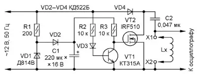 Схемная реализация прибора показана на рис. 1. Принцип действия прибора основан на ударном возбуждении колебательного контура, образованного измеряемой индуктивностью Lх и конденсатором С2 так же, как в индикаторе КЗ-витков, описанном в статье К. Мороза "Индикатор КЗ-витков в катушках с ферромагнитными магнитопроводами". Уровень напряжения, возникающий на элементах контура (индуктивность, ёмкость), достаточен для наблюдения (2...10 В) на экране осциллографа, а частота повторения (50 Гц) делает картину осциллограммы устойчивой. При межвитковом замыкании в индуктивности уровень напряжения на ней в разы меньше по сравнению со случаем отсутствия замыкания. Иногда даже становится невозможно наблюдать осциллограмму. Кроме того, если в контуре нет короткозамкнутых витков, в нём возникают затухающие колебания, а в случае наличия короткозамкнутых витков переходный процесс носит, как правило, апериодический характер.