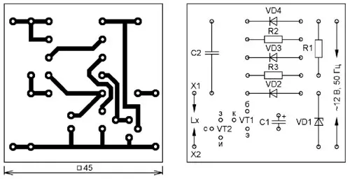 Индикатор собран на печатной плате из фольгированного с одной стороны стеклотекстолита толщиной 1,5 мм. Её чертёж и расположение элементов показаны на рис. 3. В устройстве можно применить резисторы МЛТ, С2-33 или импортные аналоги соответствующей мощности, конденсатор С1 - К50-35 или импортный, С2 - плёночный серии К73 или импортный. Стабилитрон Д814В можно заменить любым маломощным с напряжением стабилизации около 10 В, диоды КД522Б (VD2-VD4) заменимы любыми импульсными или выпрямительными малой мощности. Вместо транзистора КТ315А можно применить любой маломощный соответствующей структуры.