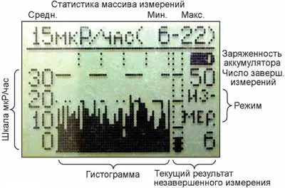 1. Построение гистограммы результатов пятидесяти последних измерений длительностью 34 с. Именно подсчитанное за такое время число импульсов в приборе [2] счётчика Гейгера-Мюллера СБМ-20 равно интенсивности излучения в микрорентгенах в час. Экран ЖКИ статистического индикатора в этом режиме выглядит, как показано на рис. 2. На нём же обозначены зоны вывода на экран различных параметров.