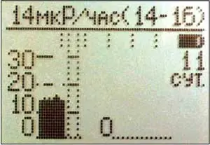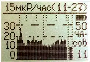Прибор со счётчиком СБМ-20 выполняет 50 измерений примерно за 28 мин. Но со счётчиком СБМ-21 этот интервал значительно больше - 4 ч 10 мин. Для удобства анализа показаний прибора, кроме коротких пунктирных линий, отмечающих каждое десятое измерение в верхней части экрана, и вертикальных пунктирных линий, отмечающих каждые 24 часа, в режиме ежечасных измерений добавлены пунктирные линии, отмечающие часовые интервалы. Отсчёт времени на экране идёт справа налево. Так легче определить, каким был уровень излучения час или сутки назад.