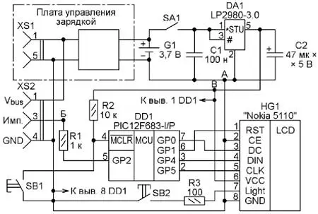 Представленная на рис. 5 принципиальная схема приставки не нуждается в особых пояснениях, поскольку основные её функции реализованы программно. На разъём XS1 (miniUSB) платы управления зарядкой встроенного в приставку литий-ионного аккумулятора G1 подают постоянное напряжение 5 В от любого стандартного зарядного устройства или от USB-разъёма компьютера.