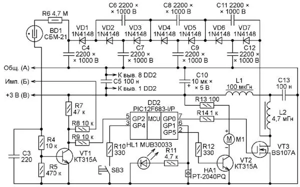 В узле установки микроконтроллера в исходное состояние в приборе [2] был применён транзистор. В результате изменений, внесённых в программу, этот узел больше не нужен, а освободившийся транзистор (VT2) использован для управления вибромотором М1 от сотового телефона. Сигнализируя о подаче питающего напряжения, микроконтроллер DD2 включает этот мотор на короткое время, а работая прерывисто, вибромотор сигнализирует о превышении уровня излучения 99 мкР/ч. Звуковой (пьезоизлучатель HA1) и световой (светодиод HL1) повторители импульсов счётчика BD1 микроконтроллер включает при уровне излучения более 40 мкР/ч или при нажатой кнопке SB3.