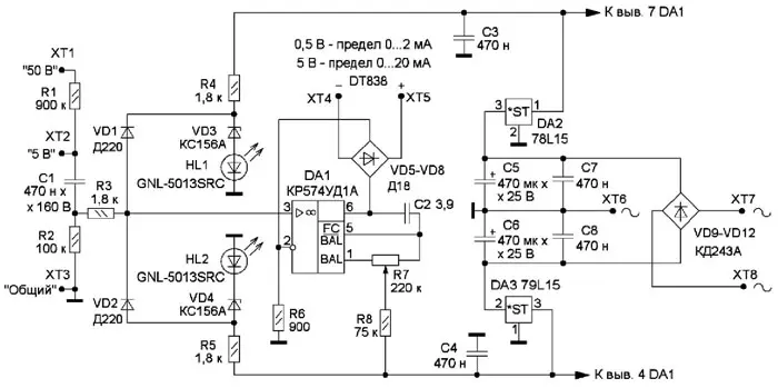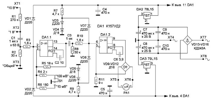 Питание осуществляется от двухполярного блока питания, выполненного на интегральных стабилизаторах напряжения DA2, DA3, конденсаторах С7- С10 и диодном мосте VD13-VD16. В качестве понижающего трансформатора можно использовать трансформатор с максимальным выходным током не менее 50 мА. Если вторичная обмотка одна напряжением 17...18 В, один её конец подключают к контакту ХТ4 для первого милливольтметра и ХТ6 для второго милливольтметра, а второй - к контакту ХТ7 или ХТ8. Подойдёт и трансформатор с обмоткой напряжением 35...36 В с отводом посередине. Вывод отвода подключают к контакту ХТ4 для первого милливольтметра и ХТ6 для второго милливольтметра, а остальные выводы подключают к контактам ХТ7 и ХТ8.