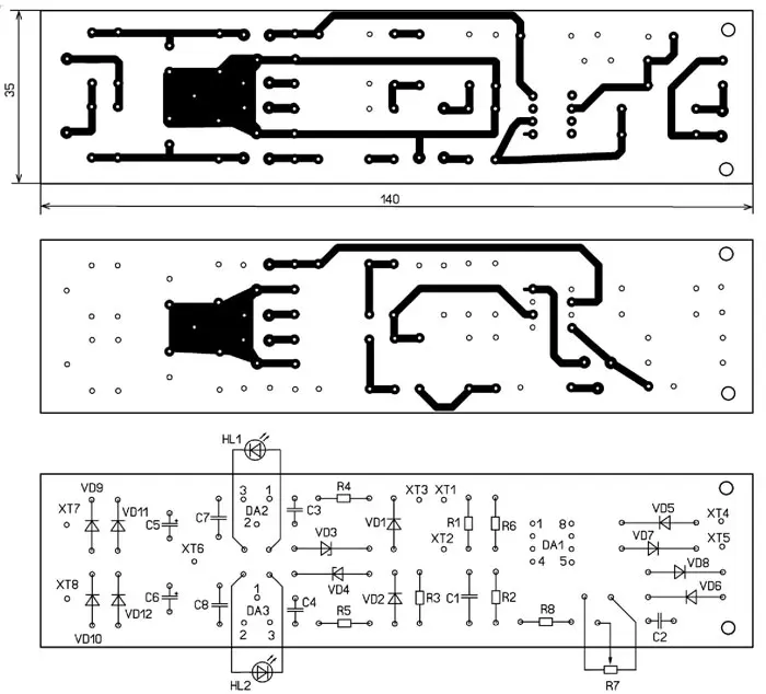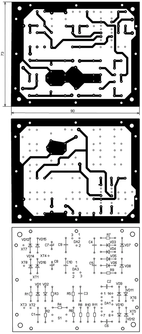 Рис. 2. Чертёж печатной платы устройства и схема размещения элементов на ней