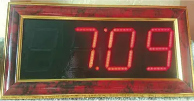На рис. 13 и рис. 14 представлен один из возможных вариантов оформления ко р пуса часов с фасадной частью, выполненной из багета для картин. Индикаторы красного свечения закрыты тонировочной плёнкой. Для изготовления корпуса были использованы две деревянные рейки размерами 320x30x10 мм и ещё две рейки, одна размерами 120x30x10 мм, вторая - размерами 120x20x10 мм. С одной из сторон каждой из длинных реек, на высоте 5 мм от края, сделаны продольные углубления (3x3 мм), которые служат направляющими для установки задней крышки корпуса часов. Для создания эффекта красного дерева все рейки обработаны водной морилкой соответствующего цвета и затем покрыты быстросохнущим лаком ХВ-784.