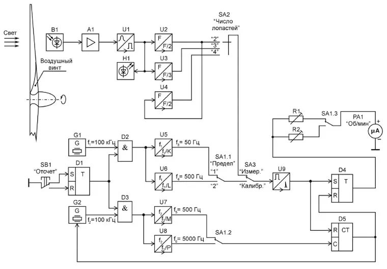 Частота следования этих импульсов F равна произведению частоты вращения воздушного винта на число его лопастей, которых может быть две, три или четыре. Для учёта этого фактора в сигнальный тракт тахометра введены делители частоты U2-U4, уменьшающие частоту импульсов F в два, три и четыре раза. Необходимый коэффициент деления выбирают переключателем SA2.