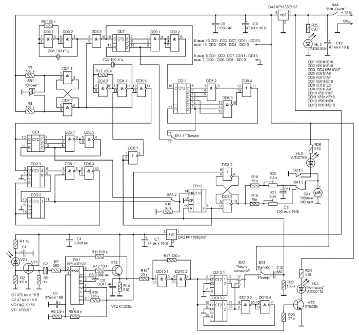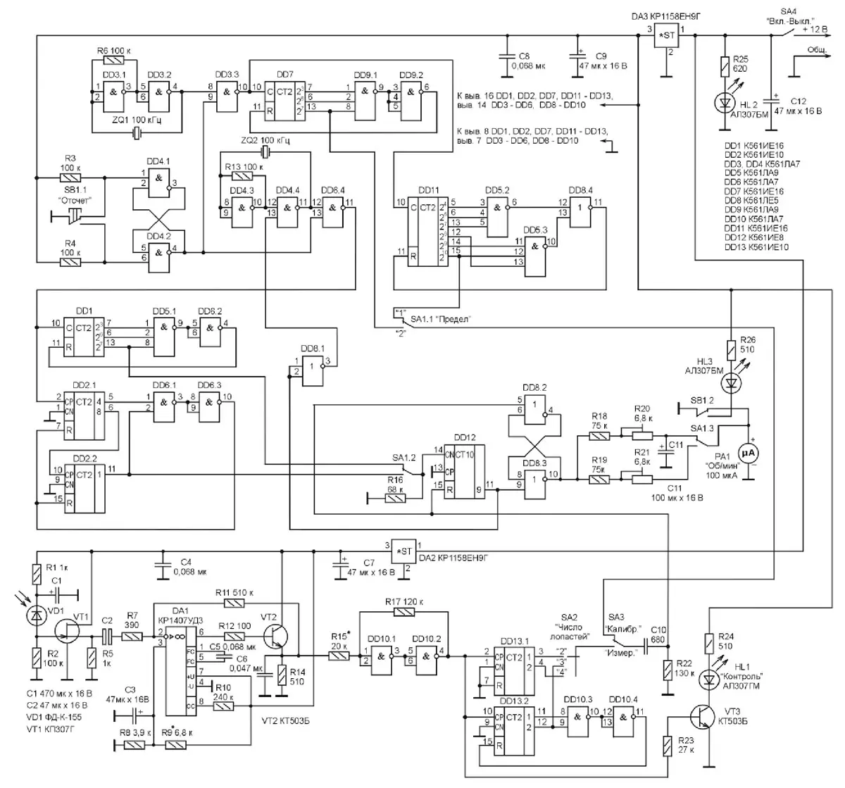 Резисторы R18-R21 ограничивают на соответствующем пределе измерения максимальный ток, протекающий через микроамперметр PA1. Их переключает третья группа контактов переключателя SA1. Конденсатор C11 уменьшает дрожание стрелки микроамперметра PA1 при низкой частоте вращения воздушного винта. Вторая группа контактов кнопки SB1 закорачивает выводы микроамперметра PA1, когда измерение не производится, что устраняет опасные для него броски тока, возникающие во время включения и выключения прибора. При нажатой кнопке SB1 эта же группа контактов включает светодиод HL3, свечение которого показывает, что идёт измерение.