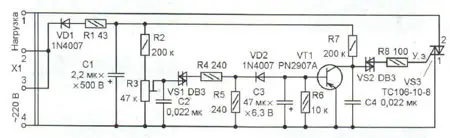 Генераторы питаются от выпрямителя на диоде VD1 со сглаживающим конденсатором С1. Резистор R1 ограничивает бросок зарядного тока этого конденсатора при подключении устройства к сети. Если её напряжение ниже порогового значения, первый генератор (на динисторе VS1) заторможен, а второй (на VS2) работает и его импульсы открывают симистор VS3. Поскольку частота их следования достаточно велика (несколько сотен герц), симистор открывается в начале каждого полупериода сетевого напряжения. Защищаемая нагрузка включена последовательно с симистором, поэтому практически всё напряжение сети поступает на неё.