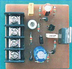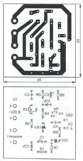 Чертёж печатной платы показан на рис. 2, а внешний вид смонтированного на ней устройства - на рис. 3. Постоянные резисторы - МЯТ, Р1-4. С2-23, подстроечный - СПЗ-19а, конденсаторы С1 и СЗ - оксидные импортные, С2 и С4 - плёночные серии MSC или керамические К10-17 (их ёмкость может быть в пределах 0,015- 0,033 мкФ). Динисторы DB3, диоды 1N4007, транзистор PN2907A и конденсаторы С1, С2, С4 указанных на схеме типономиналов можно взять из вышедших из строя энергосберегающих КЛЛ (компактных люминесцентных ламп), конечно, при условии, что эти элементы исправны. СоединительХ1 - колодка клеммная винтовая Х977В04 (DG25C-B-04P), её можно заменить любой другой аналогичной, способной работать при напряжении 300 В и токе через контакты не менее тока нагрузки. Смонтированную плату помещают в корпус из изоляционного материала и закрепляют в нём термоклеем.