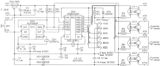 Микроконтроллер DD2 работает под управлением программы, занесенной в его FLASH-память. Разъем ХР1 дает возможность подключить программатор к микроконтроллеру, уже установленному в устройство. Это позволяет, в частности, применить микроконтроллер в корпусе любого типа, а не только того, панель для которого предусмотрена в программаторе. Кварцевый резонатор ZQ2 и конденсаторы С6, С7 — частото-задающая цепь тактового генератора микроконтроллера. Резистор R3 и диод VD3 — цепь установки микроконтроллера в исходное состояние. Кнопка SB1 предназначена для управления установкой точного времени в часах микросхемы DD1.