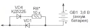 Вместо литиевого элемента для резервного питания микросхемы DD1 можно применить аккумуляторную батарею на 3,6 В, например, из трех NiCd аккумуляторов типоразмера ААА. В этом случае параллельно диоду VD1 рекомендуется подключить, как показано на рис. 2, соединенные последовательно диод VD4 и резистор R8. Они обеспечат постоянную (при наличии напряжения в сети) подзарядку батареи небольшим током, что продлит срок ее службы.