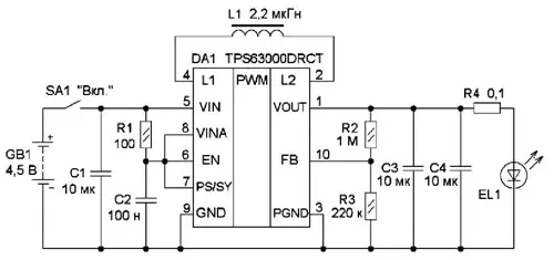 Схема фонаря показана на рис. 1. Преобразователь построен по стандартной схеме, рекомендованной производителем. В схему также включены элементы, относящиеся к фонарю, - выключатель SA1, токоограничивающий резистор R4 и светодиод EL1. Резистивный делитель R2R3 задаёт выходное напряжение преобразователя. Сопротивление резистора R3 рекомендовано производителем, а сопротивление резистора R2 рассчитывается по формуле и для напряжения 3 В составляет 1 МОм. Резистор R4 - штатный, от фонаря, и расположен рядом со светодиодом, поэтому место на плате для него отсутствует. Если такого резистора в фонаре нет, чем грешат недорогие фонари определённых производителей, необходимо предусмотреть место под его установку.