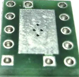 Монтаж микросхемы был произведён следующим образом. Для установки микросхемы в одном из интернет-магазинов была подобрана подходящая переходная плата. И хотя в литературе встречаются такие платы с разными обозначениями, для установки микросхемы прекрасно подошла переходная плата DFN10 eMSOP10 0,5mm [2], показанная на рис. 2. Пайка была произведена без применения паяльной станции, которой на тот момент не было, а с применением жидкого флюса тонким жалом маломощного паяльника, так, чтобы не перегреть, вначале необходимо залудить контакты и металлическую площадку снизу корпуса, которая припаивается к площадке на плате. Оставшегося и там, и там припоя должно хватить для пайки микросхемы. Также лудят площадку-теплоотвод с обратной стороны переходной платы (рис. 3), оставляя немного больше припоя, чем в двух предыдущих случаях.
