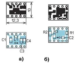 Как уже указывалось, расположение элементов и разводка печатных проводников имеют большое значение. Блокировочные конденсаторы, дроссель и микросхема должны быть расположены как можно ближе друг к другу. Резистивный делитель R2R3 обратной связи должен быть как можно ближе к выводу GND микросхемы преобразователя. Так как печатные проводники самой переходной платы уже имеют определённую длину, для более компактного размещения было решено элементы обвязки разместить на другой плате, такого же размера и расположенной под переходной. Плата - с двухсторонним расположением элементов, на верхней стороне расположены дроссель L1 и конденсаторы C1, C3, C4. На нижней стороне расположены резисторы R1-R3 и конденсатор С2. Чертёж платы показан на рис. 4,а и рис. 4,б, а внешний вид собранной платы - на рис. 5. Платы соединены между собой с помощью выводов-стоек, изготовленных из отрезков медного лужёного провода. Для дополнительного отвода тепла от микросхемы на плате с элементами в середине общей шины сформирована площадка из припоя, выровненная надфилем. После сборки двух плат она должна касаться теплоотводящей площадки переходной платы с нижней стороны, а между ними наносится теплопроводная паста. Всё это должно предотвратить перегрев микросхемы даже при значительном потребляемом нагрузкой токе.