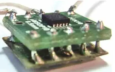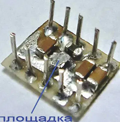 Микросхему устанавливают на своё посадочное место так, чтобы контактные площадки корпуса совпали с дорожками печатной платы, не забывая про ключ микросхемы. Это требует немного терпения и аккуратности. Далее корпус микросхемы необходимо зафиксировать, например, алюминиевой прищепкой, которая будет являться ещё и теплоотводом для микросхемы во время пайки. Потом паяльником нагревают площадку-теплоотвод на нижней стороне переходной платы, а так как она соединена несколькими металлизированными отверстиями с верхней площадкой, то припой на верхней площадке также плавится и дно микросхемы оказывается припаянным. Размеры площадок - небольшие, поэтому процесс пайки происходит достаточно быстро. Главное, чтобы не было излишков припоя, который может замкнуть контакты микросхемы. Затем заточенным жалом поочерёдно нагревают контактные площадки переходной платы у каждого из выводов микросхемы. Припой на площадке плавится, вывод запаивается. Качество контакта контролируют с помощью увеличительных очков с боков, где расположены выводы. Так были смонтированы пять экземпляров микросхемы. Конечно, при наличии паяльной станции с феном процесс заметно упрощается.