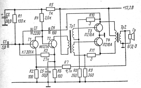Усиление звуковой частоты может быть трансформаторным и бестрансформаторным, однотактным и двухтактным или мостовым. Раньше, практически все схемы были трансформаторными. Одна из них представлена ниже.