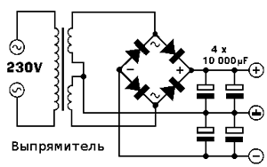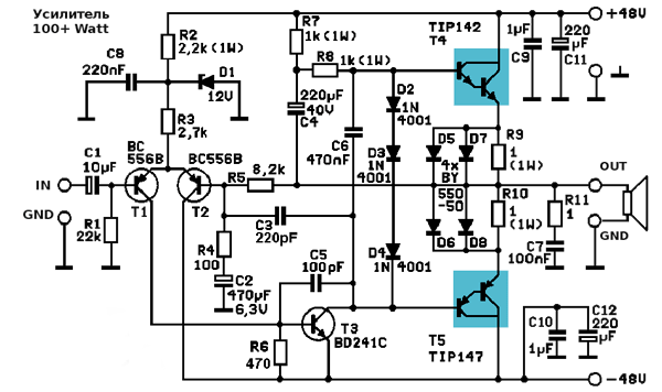 Она признана многими радиолюбителями, довольно таки проста в сборке. Выдаваемая мощность получается достаточно существенной, начиная от 100 Вт, чего уже вполне достаточно для серьезного усилителя. Соединив такой усилитель по мостовой схеме, вполне можно ожидать мощности до 500 Вт. Входное напряжение двуполярное при этом составляет около 45 – 50 Вольт. При желании запитать подобную схему от сети потребуется собрать дополнительно простенький двуполярный выпрямитель.