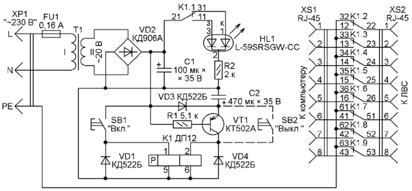 Напряжение с обмотки II трансформатора T1, выпрямленное диодным мостом VD2, сглаживает конденсатор C1. Включается кристалл красного цвета свечения светодиода HL1. Он сигнализирует о том, что устройство защиты включено, но подключение компьютера к сети Ethernet разорвано - все контакты разъёма XS2, к которому подключён интерфейсный кабель, контактами дистанционного переключателя K1.2-K1.9 соединены с контактом защитного заземления (PE) сетевой вилки XP1. Но так происходит только в том случае, если контакты дистанционного переключателя K1 находятся в положении, показанном на схеме, а это при первом включении устройства вовсе не гарантировано. Чтобы привести контакты в нужное положение, может потребоваться после первого включения отключить устройство защиты от сети и вновь включить его. В дальнейшем эта процедура не потребуется.