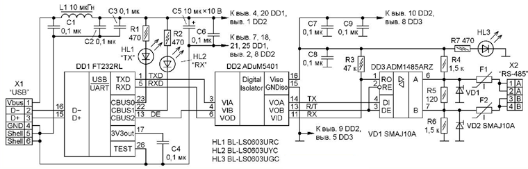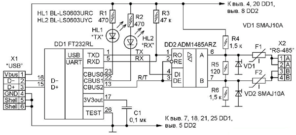 Для возможности подключения какого-либо прибора, оборудованного интерфейсом RS-485, к домашнему компьютеру или ноутбуку необходим, естественно, соответствующий преобразователь интерфейсов, например USB/RS-485. Подобные устройства широко распространены и подробно описаны в технической литературе. О варианте подобного преобразователя и пойдёт речь. Схема устройства приведена на рис. 1. В основе лежит "классическая" в подобных преобразователях популярная микросхема FT232RL (DD1). Она представляет собой специализированный, полностью аппаратно реализованный двухнаправленный преобразователь-конвертер USB/UART (UART -Universal Asynchronous Receiver-Transmitter - универсальный асинхронный приёмопередатчик) с полной поддержкой протокола USB. Микросхема требует минимальной внешней обвязки. Помимо этого, FT232RL имеет встроенную EEPROM объёмом 1024 байт и предоставляет весьма широкие возможности для пользовательского конфигурирования некоторых своих параметров и режимов работы. Например, можно выбрать режим работы от встроенного или от внешнего тактового генератора, переназна-чить функции выводов CBUS0-CBUS4 (на схеме показаны только задействованные CBUS0-CBUS2), включить инверсию сигналов UART и пр. Полную информацию о микросхеме можно получить из технической документации производителя [1]. Для конфигурирования можно использовать бесплатные утилиты MProg 3.5 и FT_Prog 3.0 c сайта производителя. С завода микросхема поставляется со штатной конфигурацией (прошивкой), в которой выбран режим работы от внутреннего тактового генератора, вывод СBUS0 (выв. 23) настроен на подключение светодиода, индицирующего передачу данных, CBUS1 (выв. 22) - для светодиода приёма данных, CBUS2 (выв. 13) - сигнал коммутации приём/ передача (DE - Driver Enable). В схеме на рис. 1 используется штатное включение микросхемы.