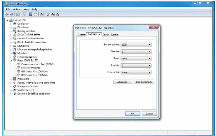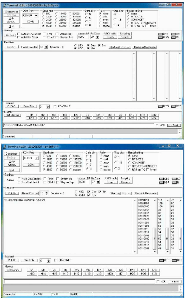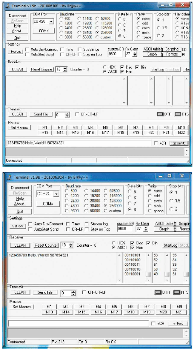 При первом подключении устройства к USB-порту компьютера потребуется установить специализированный драйвер, создающий виртуальный com-порт. Скачать драйвер можно по адресу http://www.ftdichip.com/ Drivers/VCP.htm с сайта производителя. После подключения правильно собранного преобразователя интерфейсов и установки драйвера в диспетчере задач Windows отобразится новое устройство USB Serial Port (COMxx) (рис. 11). Полностью проверить работоспособность устройства можно приёмом и передачей тестового сообщения. Это можно сделать, например, следующим способом. Потребуются два одинаковых преобразователя интерфейсов USB/RS-485 и любая программа-терминал, способная работать с com-портом. В качестве такой программы можно использовать утилиту Terminal1_9_b. Подключаем два преобразователя интерфейсов к USB-портам компьютера и проверяем появление новых устройств в диспетчере задач (рис. 11). Клеммы A и B преобразователей соединяем между собой проводами: A одного - к A другого преобразователя, B одного - к B другого (рис. 12). Далее запускаем два экземпляра программы Terminal1_9_b (рис. 13). Выбираем во вкладке COM Port нужный виртуальный COM-порт (порты должны быть выбраны разные) и нажимаем на экранную кнопку Connect (после нажатия название этой кнопки изменяется на Disconnect). В строке для сообщения любого из экземпляров программы набираем любое тестовое сообщение и нажимаем на кнопку Send. В случае, если оба устройства собраны правильно, в окне другого экземпляра Terminal1_9_b получим правильно переданное сообщение. На рис. 14 показаны приём/передача тестового сообщения на скорости 256 кбот.