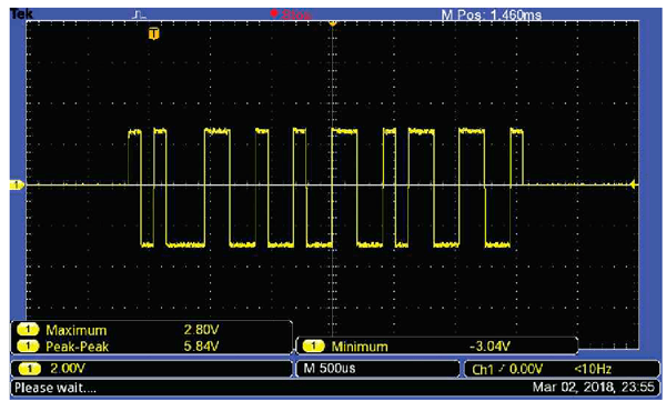 Помимо этого, проконтролировать работоспособность устройства можно с помощью осциллографа и всё той же программы-терминала. На рис. 15 приведена осциллограмма передачи сообщения 123, сигнал снят с клеммы A RS-485 относительно клеммы B.