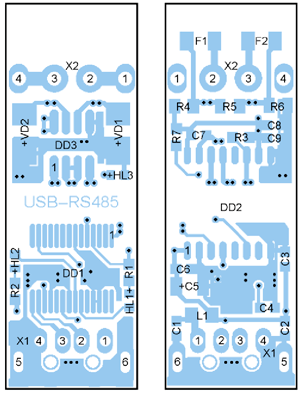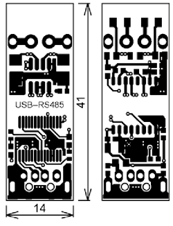 Чертёж печатной платы преобразователя приведён на рис. 3. Печатная плата максимально минимизирована под размер обычной "флешки" и выполнена на фольгированном с двух сторон стеклотекстолите FR-4 размерами 14x41 мм. Детали расположены с обеих сторон. На условно верхней стороне - разъёмы X1 и X2, микросхемы DD1 и DD3, цепи индикации R1HL1, R2HL2 и HL3, а также защитные диоды VD1 и VD2. Остальные - на условно нижней стороне платы. Расположение элементов показано на рис. 4. Все резисторы и конденсаторы, кроме С5, а также светодиоды применены типоразмера 0603. Конденсатор С5 - танталовый типоразмера Case A (размеры 3,2x1,6x1,6 мм) на номинальное напряжение 10 В. Разъём USB (X1) - USB-AR (DS1097-B) или аналогичный. Разъём X2 - ECH381R-04P со съёмной ответной частью EC381V-04P Самовос-станавливающиеся предохранители F1 и F2 - MF-USMF010 или аналогичные на ток срабатывания от 100 мА (размеры 3,2x2,5 мм). Дроссель помехопо-давления L1 - BLM21PG331SN1D. Однонаправленные защитные диоды-супрессоры VD1 и VD2 желательно заменить на двухнаправленные SMAJ10CA-TR в корпусе SMA/DO-214AC. Фото собранного устройства приведены на рис. 5 - рис. 10.