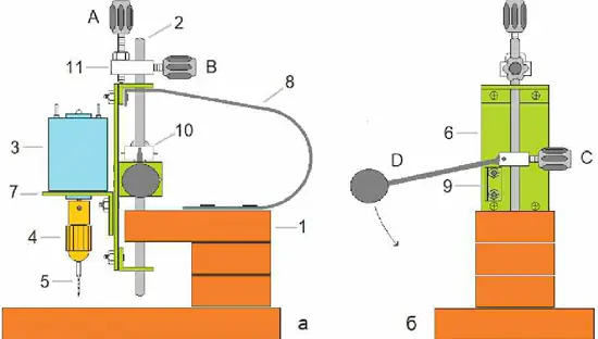 Конструкцию устройства поясняет рис. 1. Основой инструмента является наборная станина 1, изготовленная из четырёх склеенных прямоугольных брусков ДСП толщиной около 18 мм, где в верхний брусок запрессован вертикальный цилиндрический шток 2 с размещёнными на уголке 7 электродвигателем 3 с цанговым патроном 4 и сверлом 5. Перемещение каретки 6 вдоль штока обеспечивается направляющими, выполненными в виде уголков с отверстиями, соответствующими его диаметру, и закреплёнными к верхней и нижней частям планки, являющейся её основой. Поступательное движение каретки с одновременной выборкой зазоров между штоком и направляющими обеспечивается плоской пружиной 8 (на рис. 1 ,б не показана). Она же в исходном состоянии за счёт своей упругости удерживает каретку в крайне верхнем положении. При выполнении сверления перемещение сверла производится за счёт вертикального давления стержня рукоятки D на упор 9, установленный на каретке. Его ось вращения размещена на неподвижном держателе 10, закреплённом на штоке винтом С. Такой способ его крепления позволяет при необходимости выбирать удобный для работы наклон рукоятки путём перемещения держателя. Регулировочные винты А и В в держателе 11 верхней части штока предназначены для изменения исходного положения сверла над платой при подготовке устройства к работе.
