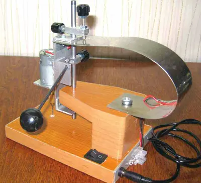 Оформление конструкции станочка может быть произвольным, обеспечи-ващим удобство работы с ним. Исходя из этих соображений, его питание лучше осуществлять от сетевого блока питания с возможностью регулировки выходного напряжения. Целесообразно предусмотреть также выключатель для оперативного отключения электродвигателя и мощный светодиод для подсветки рабочей области сверления. Для удобства смены сверла в основании станины под патроном полезно просверлить сквозное отверстие диаметром 5...7 мм. Внешний вид одного из вариантов исполнения такого станочка представлен на рис. 3.