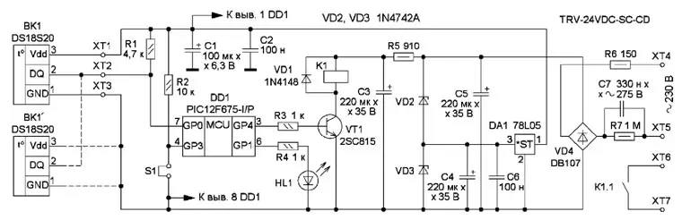 Светодиод HL1 сигнализирует о включённом реле короткими вспышками при нагреве и длинными при охлаждении. В программе предусмотрен контроль целостности цепи датчика температуры с сигнализацией светодиодом. При коротком замыкании в цепи датчика следует серия из пяти длинных вспышек с небольшой паузой, а при обрыве - серия из пяти коротких вспышек с небольшой паузой и выключением реле.