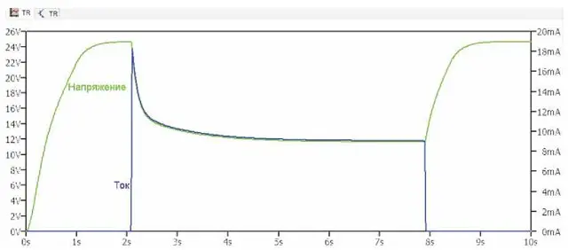 Для снижения потребляемой мощности при включённом реле использован гасящий резистор R5. Для включения реле необходим номинальный ток, а удержание реле происходит при меньшем токе. В момент включения реле номинальный ток обеспечивает конденсатор С3, а после срабатывания реле тока через резистор R5 хватает для удержания реле во включённом состоянии. Схема была промоделирована в бесплатной программе LTSpice [1] (файл TR.asc), а затем собрана в "железе". На диаграмме (рис. 2) видно, что после срабатывания реле на нём остаётся напряжение около 12 В и ток через него протекает около 9 мА, что достаточно для удержания.