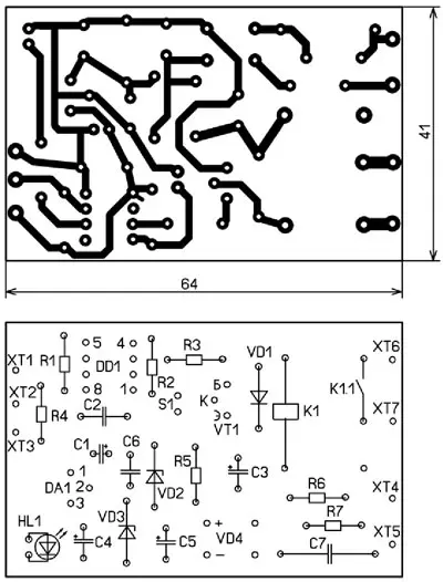 Элементы регулятора смонтированы на односторонней печатной плате из фольгированного стеклотекстолита толщиной 1...1,5 мм, чертёж которой показан на рис. 3. В устройстве при менено реле TRV-24VDC-SC-CD [2] с номинальным напряжением 24 В и сопротивлением катушки 1280 Ом, его можно заменить аналогичным реле серии TRJ. Транзистор 2SC815 можно заменить любым транзистором серии КТ315 или КТ3102. Стабилитроны VD2, VD3 должны быть на напряжение стабилизации 12 В и мощностью рассеивания не менее 1 Вт. Конденсатор С7 - импортный, рассчитанный на работу на переменном напряжении не менее 275 В или К73-17 с номинальным напряжением не менее 630 В, оксидные конденсаторы - К50-35 или импортные, остальные - керамические К10-17 или импортные, резисторы - МЛТ, С2-23.