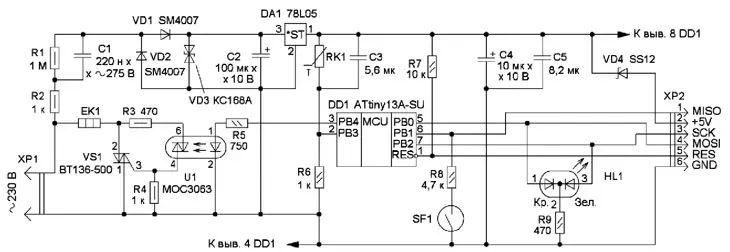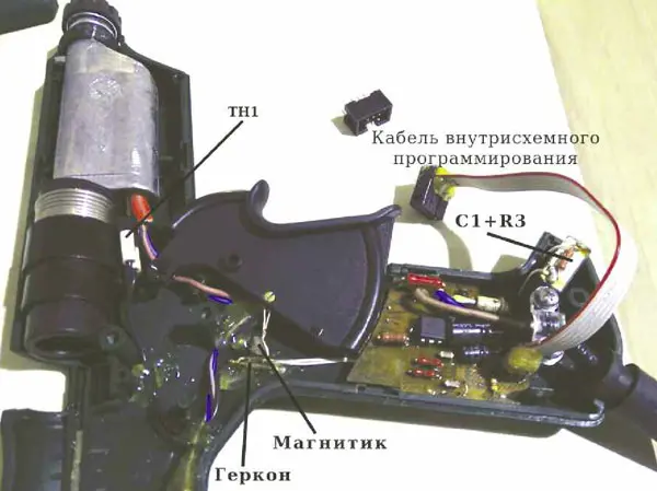 На рис. 1 представлена схема устройства. Нагревательный элемент EK1 клеевого пистолета подключается к сети 230 В через симистор VS1, которым управляет оптопара U1 с встроенным детектором перехода через ноль, что уменьшает помехи в сеть. Схема питания схемы выполнена по традиционной бестрансформаторной схеме из-за малого доступного пространства в рукоятке пистолета. Термостойкий терморезистор RK1 взят от нагревателя неисправного лазерного принтера. Температурный рабочий диапазон большинства терморезисторов не превышает 160 оС, что и заставило применить именно такой. Он аккуратно вставлен между нагревателем и дюралевым корпусом, внутри которого происходит нагрев клеевого стержня. Двухцветный светодиод HL1 служит для индикации режима нагрева: дежурный режим (Др) с температурой нагрева примерно 100 оС и рабочий режим (РР) с температурой нагрева 160...180 оС. Если пистолет находится в ДР более 4 мин, таймер отключает нагревательный элемент. Для перехода между режимами слегка нажимают на курок, магнит, закреплённый на нём вызывает замыкание контактов геркона, что приводит к прерыванию Int0 в микроконтроллере.